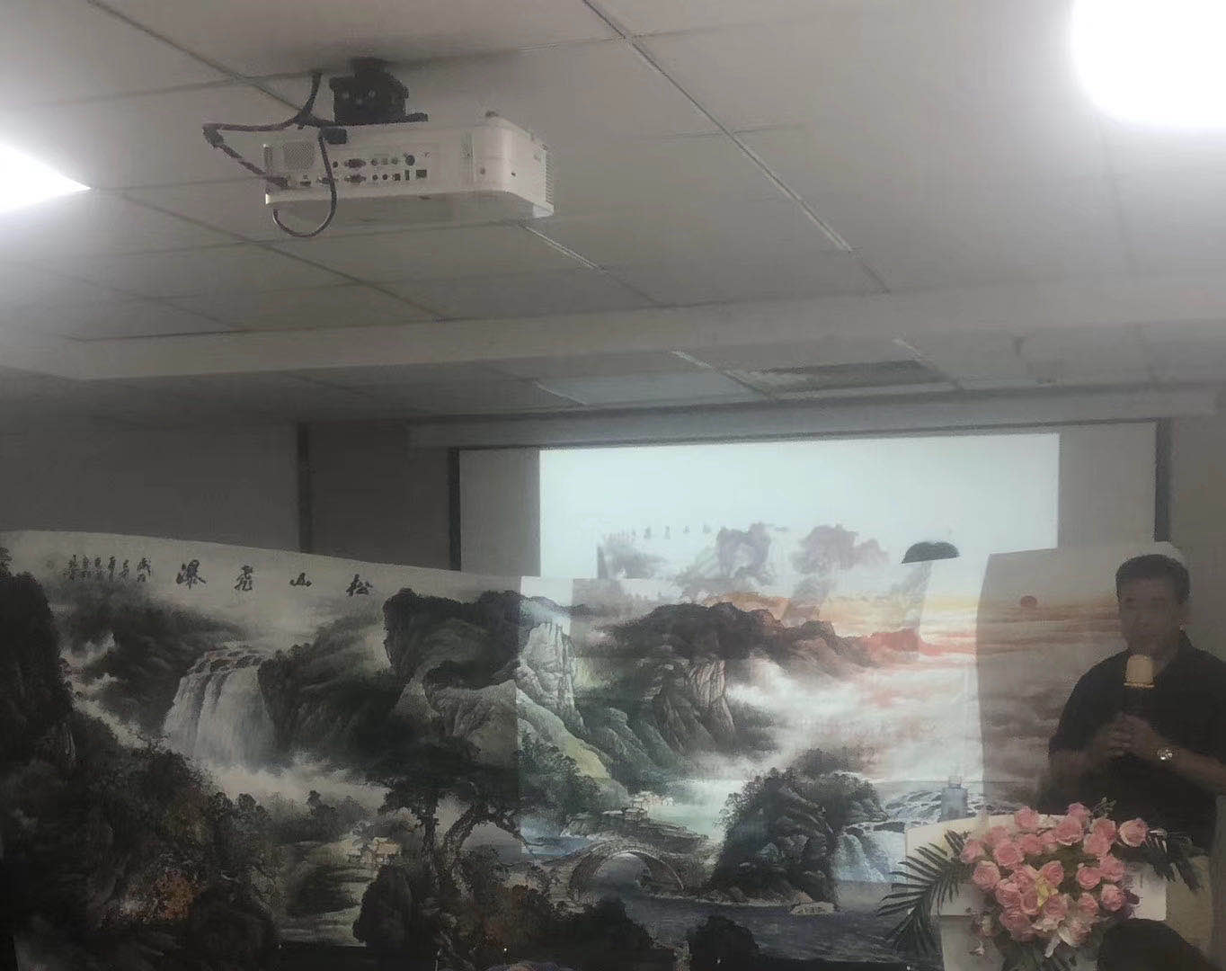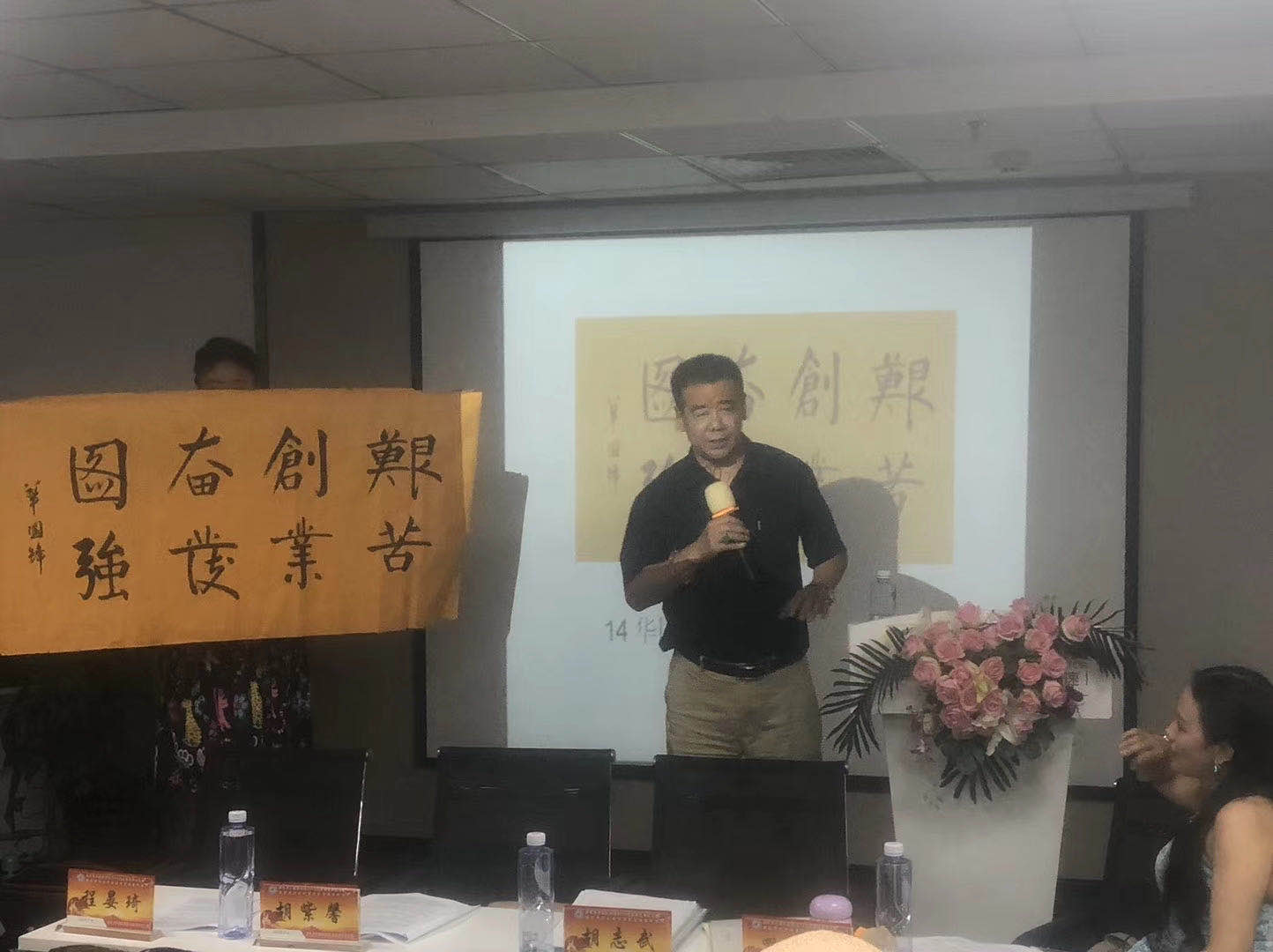 中共中央办公厅老干部局陈丙伏主任(联合国华商主席团执行主席、联合国工商院大学保健养生所执行所长)出席致辞。中国人民公安大学博导程晏琦(原公安部刑侦局副处长、中艺时代北京网络科技有限公司董事长、中国书画艺术收藏网总裁、北京世纪红歌书画院院长、联合国世界华商联合会主席团执行主席/书画工委主席、联合国世界工商研究院大学北京市分校校长/书画研究所所长)出席致辞/拍卖字画15幅并现场赠送胡志武主席一幅字画“峡江图”。公安部第十局刑侦专家/原郑州铁路公安局政委(副厅局级)王仲刚(著名警营作家、实力派书法家、联合国华商书画艺术司司长、联合国工商院大学文学艺术所所长、全国铁路公安文联副主席、全国铁路公安作协副主席、河南省文学院院士)题写书法“胡氏茅庐古树普洱茶”及“绿色经济学”祝贺会议召开。联合国华商演艺署书画艺术司副司长李柏霖出席会议并给胡志武主席赠送“厚德载物”及“忠厚传家德为先/仁义处世信当先”等书法作品。联合国华商演艺署书画艺术司副司长廖勇民出席展示字画并赠送胡志武主席8平尺字画作品留念。